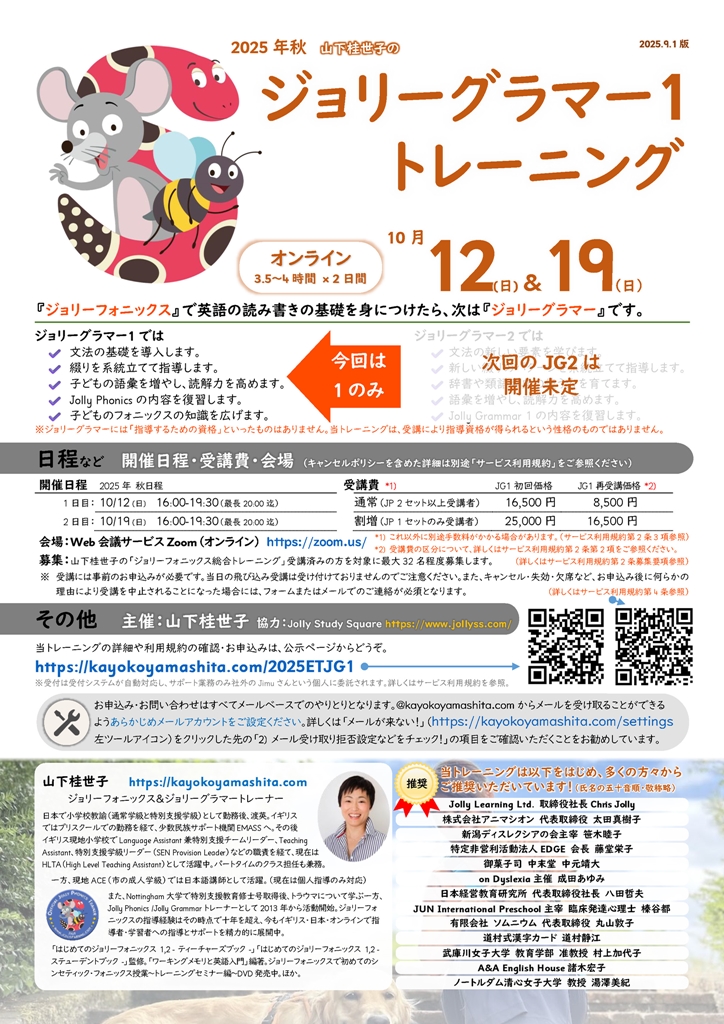 日本語版「はじめてのジョリーフォニックス」の 2 冊が終わったら、次はジョリーグラマー。この内容と指導方法をしっかりと身につけましょう。今回はオンライントレーニングという形式で開催いたします。大きな特徴は次の通りとなります。