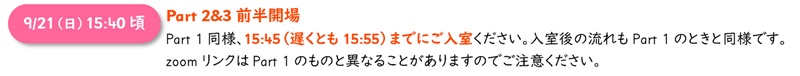 2025/9/21Part 2&3 Zoom 会議室へのリンク 内【Zoom 会議室への入室】 末尾の【当日朝の遅刻・欠席】開示
