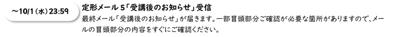 6) | 8/18 (月) 10:56 | S.E. さま | e*******@********.jp | 2025T-083 | 秋 JP | 10/4 (土) 郵送物発送完了。全日程が終了いたしました。またのご受講をお待ちしております。 *** ポータル内で必要になるパスワードは 8/22 (金) 1:35「手続完了」のメールに記載されたものをご利用ください。 | 8/18 (月) 10:56 | 8/19 (火) 20:43 | 8/22 (金) 01:35 | 9/4 (木) 22:05 | 9/18 (木) 21:49 | 9/30 (火) 21:29 | |