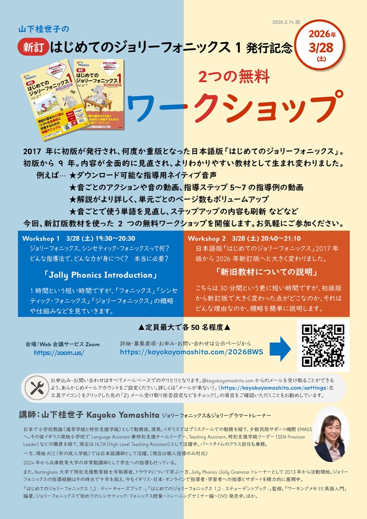 2017 年に発行された日本語版「はじめてのジョリーフォニックス」の新訂版が 3/10 に発売開始となりました。これを記念して、新訂版の教材を使用した無料ワークショップを 2 つ開催します。大きな特徴は次の通りとなります。